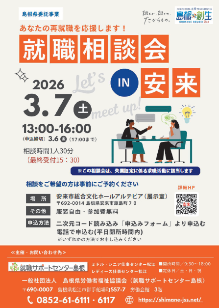 就職・転職をお考えの方を対象として出張「就職相談会IN安来」を開催します。お気軽にご参加ください!